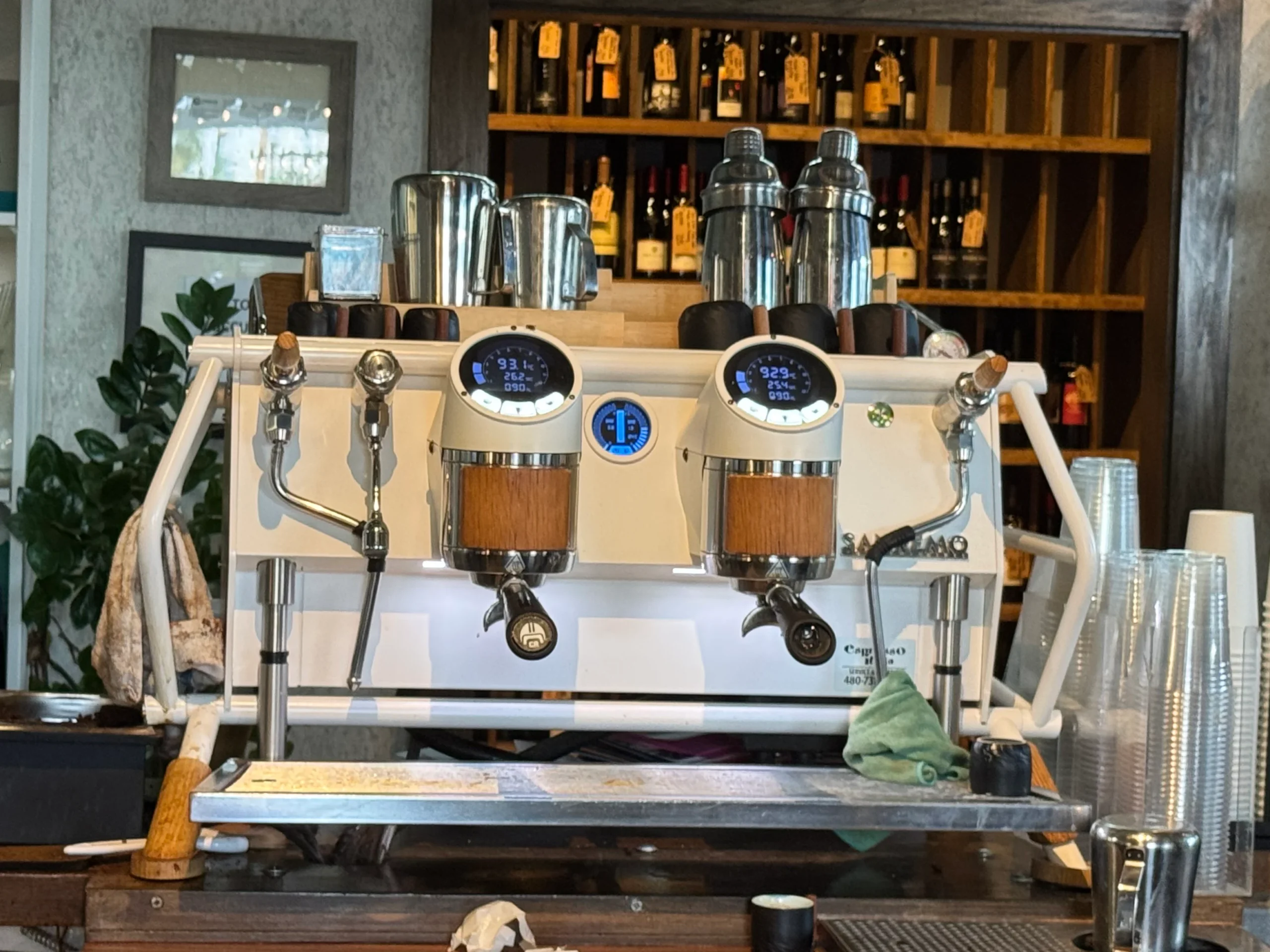 The space stops you in your tracks. Large floor to ceiling glass panes wrap the entrance. Inside, custom geometric wood carvings cover the walls and woven pendant lights hang overhead, all of it illuminated by soft backlighting that keeps the room warm but crisp. The barista counter is wrapped in bright marble. The furniture is sleek light wood with gorgeous woven chairs that somehow feel both minimal and comfortable at the same time. It is the kind of interior that makes you wonder who designed it and whether they do residential work. Oh, and there is a gorgeous Victoria Arduino espresso machine behind the bar. The Mesa location runs a super automatic machine. Chandler gets the Eagle One. We lucked out.
