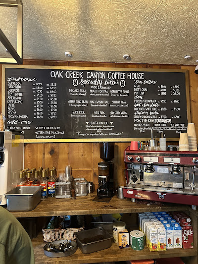Oak Creek Canyon Coffee House is located at the historic Don Hoel's Cabins. The shop serves a full menu of traditional espresso drinks and tea lattes. It also features a selection of specialty lattes with names inspired by local trails. The coffee house is part of the Canyon Market. It offers snacks and some groceries for resort guests and travelers. The staff is described as friendly and welcoming.