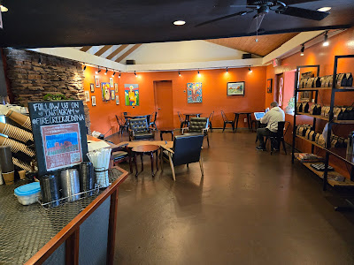 Black Potion Sedona is a coffee shop combined with a crystal and metaphysical boutique. The shop has a relaxing new age atmosphere. The menu features classic espresso drinks and creative signature lattes like the Smoked Praline and Madagascar Vanilla. It sources its specialty coffee from a Phoenix-based roaster partner (Peixoto Coffee) whose beans originate from a family farm in Brazil. In addition to coffee the shop sells crystals and offers services such as aura readings.