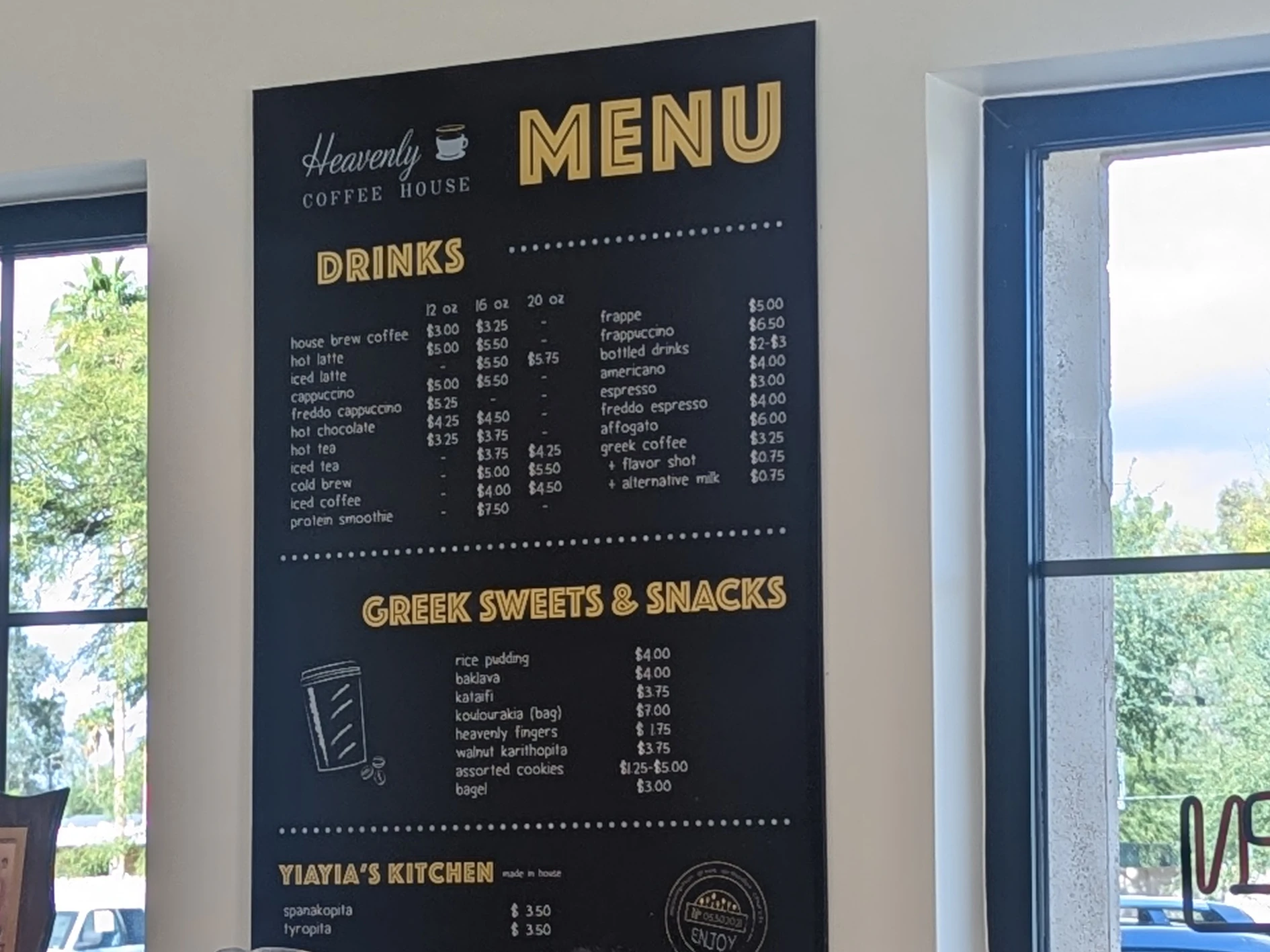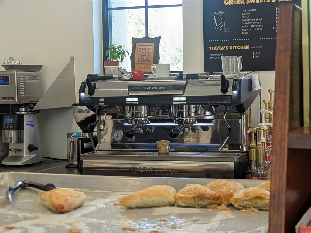 Located in the beautiful courtyard of the Assumption Greek Orthodox Church, Heavenly Coffee House is a charming cafe specializing in traditional Greek coffee and homemade pastries. The menu features a wide array of authentic Greek sweets like baklava and kataifi, alongside savory, from-scratch items from "Yiayia's Kitchen." In addition to classic espresso drinks pulled on a beautiful Nuova Simonelli Aurelia II, the shop offers unique Greek coffee preparations. The outdoor seating area is perfect for relaxing and enjoying your drink or dessert.