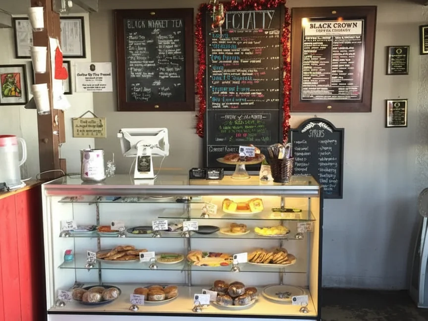 Black Crown Coffee Co. is a unique two-story coffee shop in Tucson with a distinct grunge rock-and-roll aesthetic. The space features a cozy main floor and a loft lounge area accessible by a spiral staircase, which is often used by students and remote workers. Black Crown roasts its own coffee in-house and is known for its creative specialty drinks with bold names, like the "Tarheel" and "Black Widow." The shop also features one of the most extensive lists of syrup flavors in the city, offering a massive variety for customizing drinks.