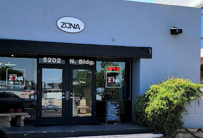 Coffee Zona is a local Phoenix coffee shop with a unique cozy vibe known for selling a collection of vinyl records alongside its beverages. The extensive menu features a full espresso bar with creative lattes, Lotus energy drinks, and various food options including breakfast burritos and bagel sandwiches. The shop proudly serves coffee from local roasters and offers pour-over for those seeking a more hands-on coffee preparation method.